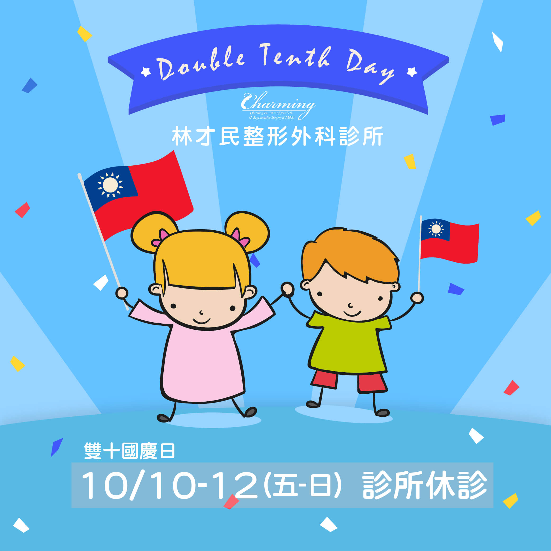 View Larger Image 【2025雙十國慶休診】 【2025雙十國慶休診】 今年雙十國慶高雄也有很多活動 不想跑到南投看煙火的朋友們 可以考慮到高雄遊玩唷 貼心提醒: 診所10/10-12(五-日) 公休三日 高雄活動: →高雄市114年國慶升旗典禮暨健走慶祝活動(澄清湖風景區大草原) →左營萬年季(左營蓮池潭) →高雄愛月熱氣球 愛河場(愛河) →FOCASA馬戲藝術節(高雄展覽館輕軌站旁大草地) →嬉啤派對(駁二藝術特區) #自體脂肪移植 #高雄整形 #林才民醫師 #周治剛醫師 #整形外科專科醫師 #美容外科專科醫師 Tung Fiona2025-10-09T10:45:49+08:002025/10/09|